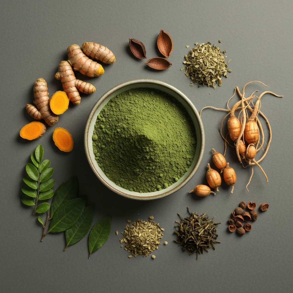 Standardized extracts from medicinal plants including Ashwagandha, Turmeric, and Green Tea.